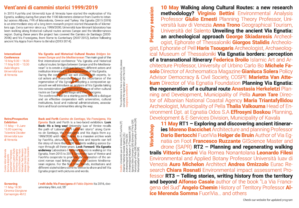 Στο πλαίσιο αυτό, ο Δήμος Καβάλας συμμετείχε το Μάιο στη Βενετία σε δύο εκδηλώσεις που διοργάνωσαν ο οργανισμός FuoriVia σε συνεργασία με το πανεπιστήμιο IUAV της Βενετίας. Συγκεκριμένα, η κ. Ευφροσύνη Μπόσκου, ιστορικός εθνολόγος και διπλωματούχος στο σχεδιασμό, διοίκηση και πολιτική του τουρισμού, συμμετείχε με ανακοίνωσή της με τίτλο «Towards a Sustainable Planning of Via Egnatia Cultural Route: From Local to the Transnational” στη θεματική “Planning Via Egnatia : the regeneration of a cultural route” στο διεθνές συνέδριο “Via Egnatia and Historical Cultural Routes: Bridges between Europe and the Mediterranean”, που έλαβε χώρα στη Βενετία στις 10-11/5/2017.